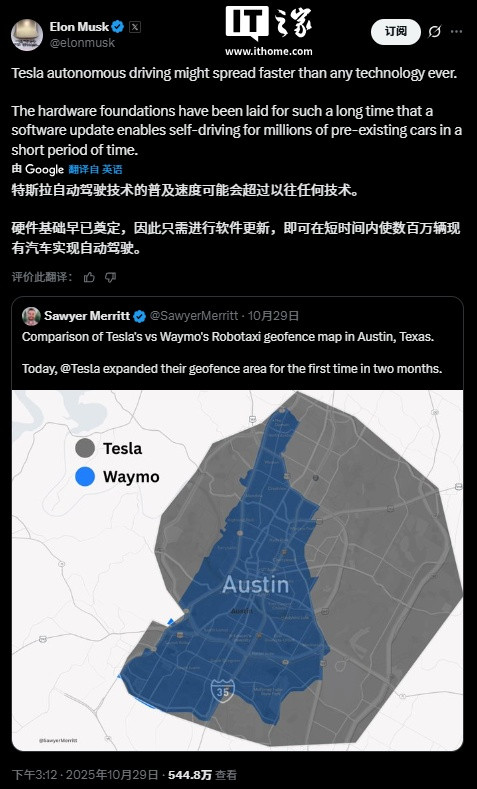 本周,特斯拉将其奥斯汀Robotaxi服务区域扩大至243平方英里(IT之家注:约629.4平方公里),达到迄今为止的最大规模,几乎是两个月前覆盖范围的三倍。此次扩张使特斯拉在当地的服务面积远超Waymo,后者目前的服务区域仍维持在约90平方英里左右。